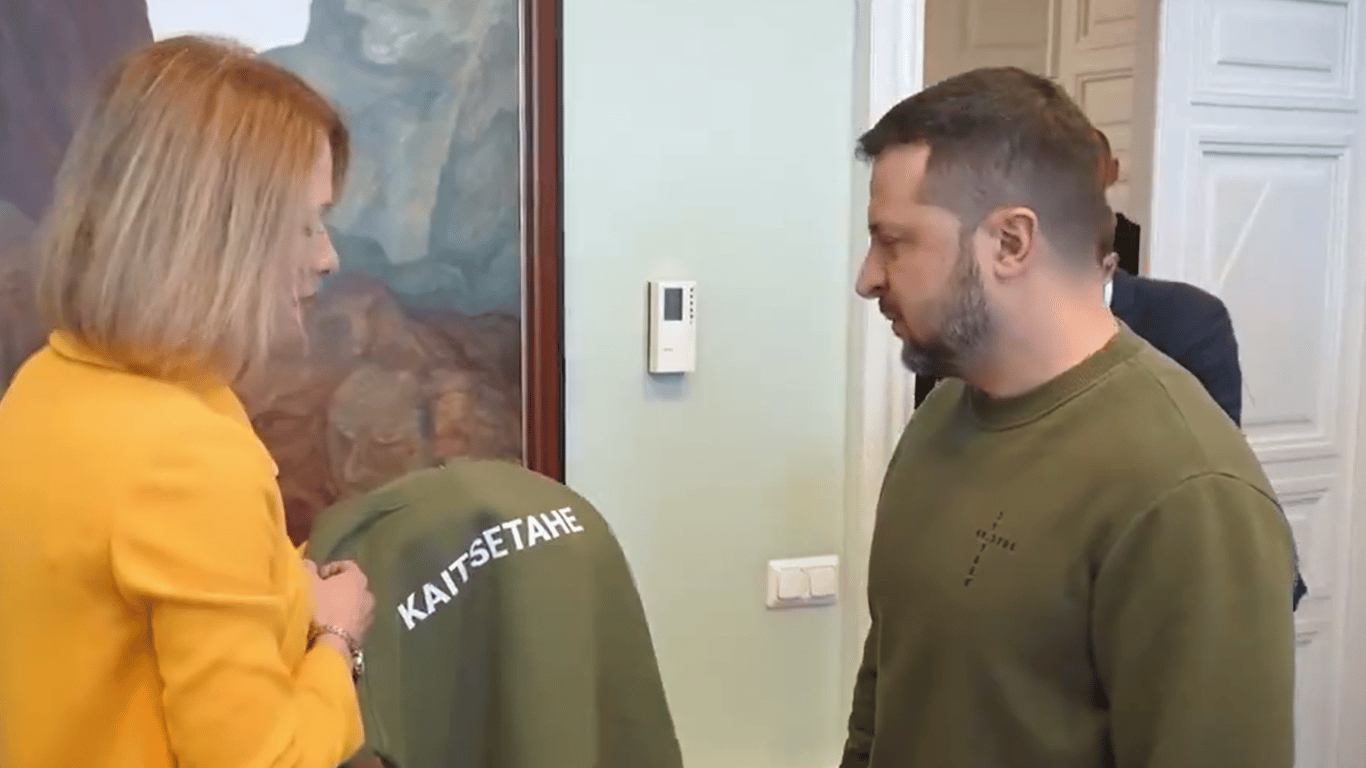 Прем’єр-міністр Естонії Кая Каллас подарувала Президенту України Володимиру Зеленському світшот із патріотичним написом. У цьому одязі він виступив перед естонськими парламентарями.